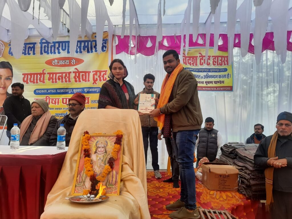 सुल्तानपुर,कुड़वार संवाददाता(इंद्र सेन दूबे)।कड़ाके की ठंड व शीतलहर बढ़ते ही मददगारों के सेवा भाव के लिए हाथ बढने लगे है। समाज की सेवा करके ही सच्चा सुख प्राप्त किया जा सकता हैं। इसी सेवा भाव के उद्देश्य से यथार्थ मानस सेवा ट्रस्ट के बैनर तले समाजसेविका मनीषा पाण्डेय ने पांच सौ जरूरतमंदों को कंबल वितरित किया।इसके साथ ही जिले के पत्रकारों व विशिष्ट जनो को सम्मानित करते हुए खिचड़ी भोज कराया गया।