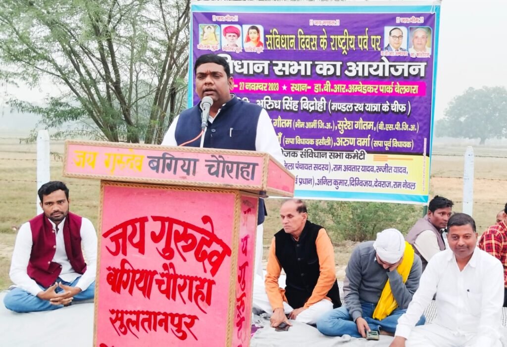 जयसिंहपुर सुलतानपुर।(दुर्गा प्रसाद,संवाददाता)तहसील क्षेत्र के बेलगरा गांव में स्थित अम्बेडकर पार्क में आयोजित संविधान दिवस कार्यक्रम के अवसर डॉ भीमराव अंबेडकर को याद करते हुए संविधान की विशेषताओं पर विस्तृत चर्चा की गई। आयोजित कार्यक्रम में पूर्व सपा विधायक अरुण वर्मा ने मौजूदा सरकार को संविधान विरोधी सरकार बताया और कहा कि संविधान खतरे में है।
