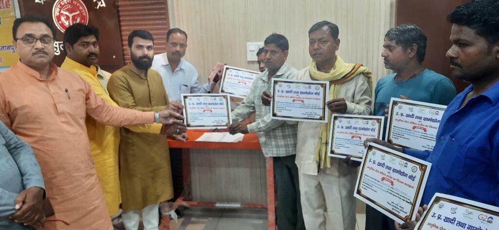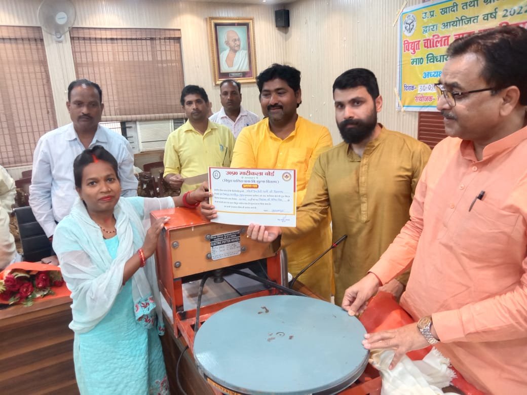 सुलतानपुर।उ0प्र0 खादी तथा ग्रामोद्योग बोर्ड ने टूल किट्स वितरण योजना के तहत पात्र एवं चयनित लाभार्थियों को विधायक प्रतिनिधि पुलकित सिंह एवं भाजपा जिला उपाध्यक्ष प्रवीन कुमार अग्रवाल के साथ ही यूपी माटीकला बोर्ड के सदस्य मगंरू प्रसाद प्रजापति ने 40 अदद इलेक्ट्रिक चाक मशीन एवं एक समूह को आधुनिक दीया मेकिंग मशीन का निःशुल्क वितरण किया ।